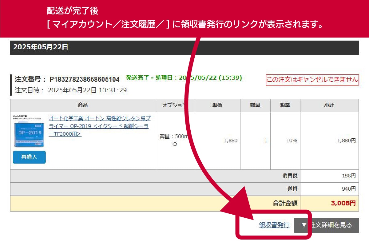 「マイアカウント」→「注文履歴」から発行可能です。※画像クリックで拡大