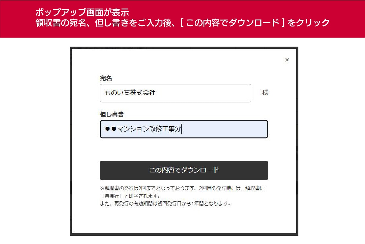 領収書はシステム上、お客様ご自身でダウンロードしていただく方式となっております。