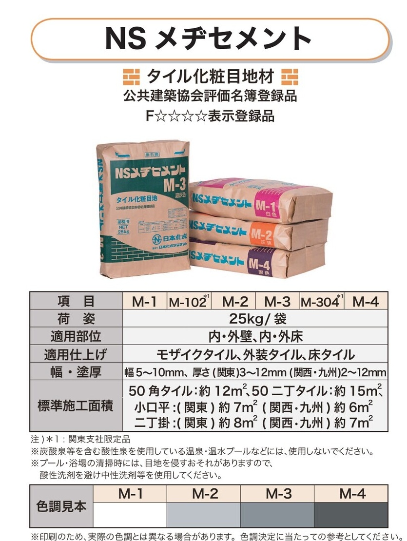 タイル化粧目地材 公共建築協会評価名簿登録品 ■ 耐候性に優れているため、いつまでも変わらない色調を保ちます。 ■ 最適に粒度調整した細骨材を使用しているため、ひび割れ・目地切れの心配がありません。 ■ 吸水量・透水量が小さく、外部からの水の浸入を抑制します。 ■ 目地材として、社団法人公共建築協会の建築材料等評価名簿に規定する既製調合目地材の品質を有しています。 |