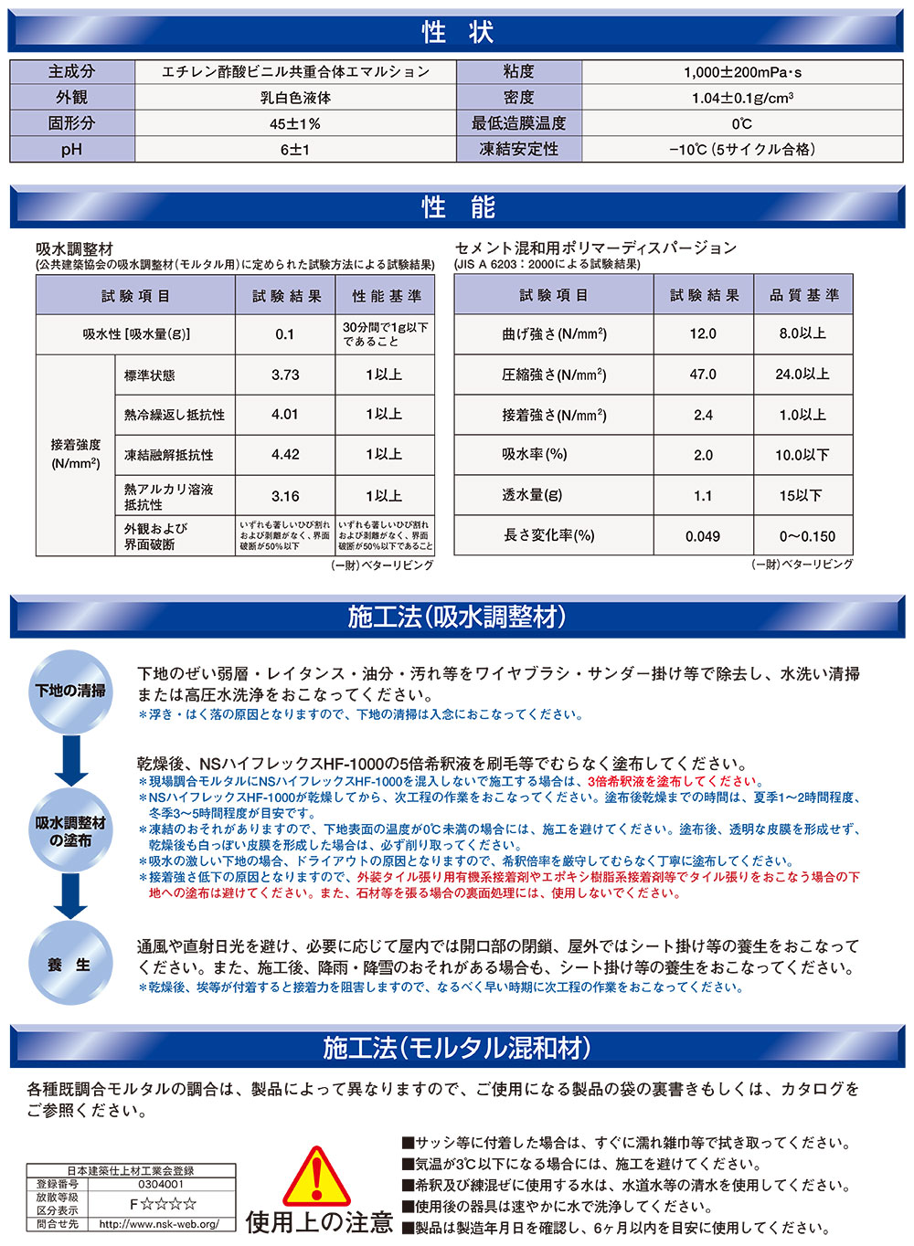 吸水調整材・セメント混和用ポリマーディスパージョン 公共建築協会評価名簿登録品・日本建築仕上学会M-101規格適合品 ■吸水調整材・ドライアウト防止 吸水の激しい下地にNSハイフレックスHF-1000を塗布することで、塗り付けたモルタルの水分が急激に移行することを抑制し、ドライアウトを防止できます。 ■モルタル混和材・モルタルの物性向上 NSハイフレックスHF-1000を混入したモルタルは、セメントと骨材が強固に結合するため、セメントモルタルの物性を改善します。 ■長期接着耐久性の保持 耐アルカリ性に優れているので、長期間安定した接着性能を維持します。 |