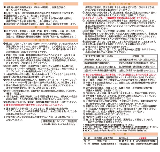 | 用途 | ログハウス・玄関廻り・板壁・門扉・軒天・下見板・戸袋・柱・長押・欄間・その他建物の内・外装建築物の白木の保護及び汚れの抑制。 |
