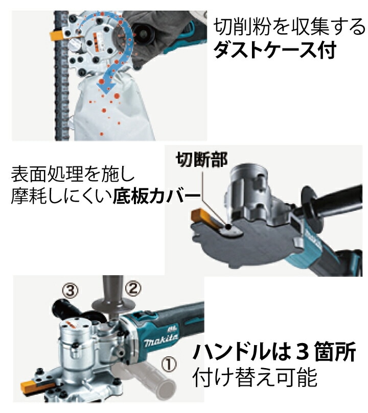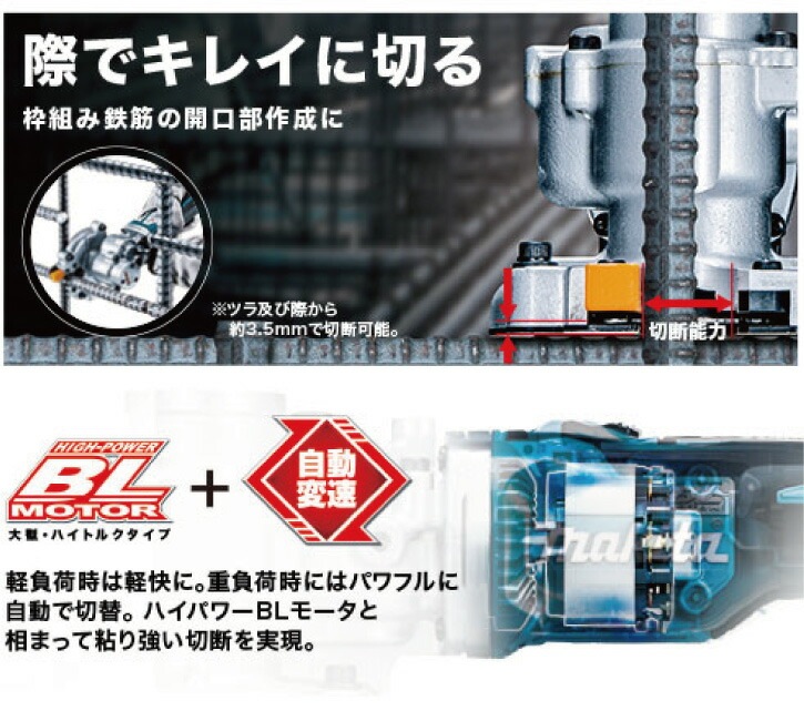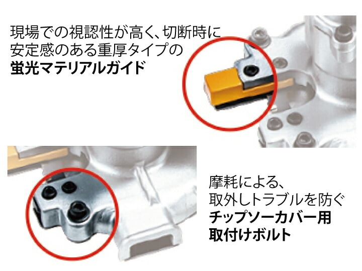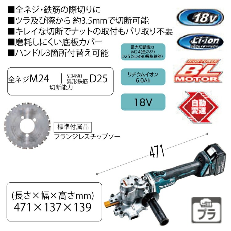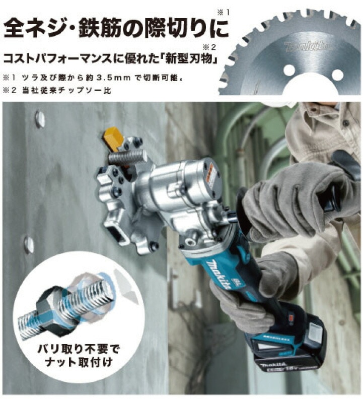 全ネジ・鉄筋の際切りに! ツラ及び際から約3.5mmで切断可能 コストパフォーマンスに優れた「新型刃物」採用! ※当社従来チップソー比 際でキレイに切る 枠組み鉄筋の開口部作成に BLMOTOR+自動変速 軽負荷時は軽快に。重負荷時にはパワフルに 自動で切替 ハイパワーBLモーターと相まって粘り強い切断を実現 バッテリBL1860B・充電器DC18RF ダストケース・フランジレスチップソー・ケース付 [約27分(実用充電)/約40分(フル充電)] 切削粉を収集するダストケース付 表面処理を施し摩耗しにくい底板カバー ハンドルは3箇所付け替え可能 現場での視認性が高く切断時に安定感のある重厚タイプの蛍光マテリアルガイド 摩耗による、取外しトラブルを防ぐチップソーカバー用取付けボルト バッテリ残容量表示ランプ付 |