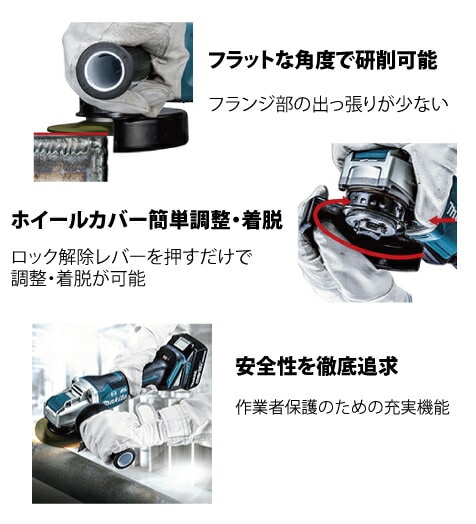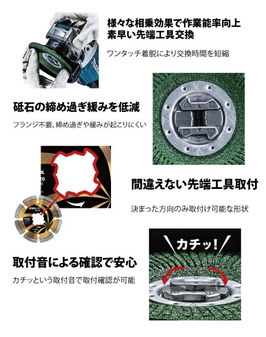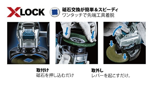 X-LOCK対応、ワンタッチで先端工具着脱 手軽さと安全性を徹底追求 砥石交換が簡単&スピーディ ワンタッチで先端工具着脱 取付け:砥石を押し込むだけ 取外し:レバーを起こすだけ 様々な相乗効果で作業能率向上 素早い先端工具交換 ワンタッチ着脱により交換時間を短縮 砥石の締め過ぎ緩みを低減 フランジ不要、締め過ぎや緩みが起こりにくい 間違えない先端工具取付 決まった方向のみ取付け可能な形状 取付音による確認で安心 カチッという取付音で取付確認が可能 フラットな角度で研削可能 フランジ部の出っ張りが少ない ホイールカバー簡単調整・着脱 ロック解除レバーを押すだけで調整・着脱が可能 |