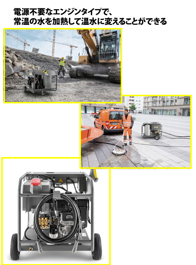 電源不要なエンジンタイプで、常温の水を加熱して温水に変えることができる高圧洗浄機です。 燃料はガソリンで、耐久性の高いクランクシャフトポンプを用い、 効率的な燃焼を行うテクノロジーで、様々な場所と環境で使用する事が出来ます。 また、温水の洗浄力で、高い洗浄効果を得られる事が可能です。 毎時800リットルの水量と200バールの吐出圧力を備えた温水高圧洗浄機 建設業、地方自治体での公共施設などの建物で、厳しい環境下での 洗浄アプリケーションに直面した場合でも優れた性能を発揮します。 ガソリンエンジンで駆動するため、外部電源が不要になり屋外での落書きや潤滑油などによる頑固な汚染も除去 パワフルなガソリンエンジン 外部電源がなくても使用可能。 排気ガス基準EU STAGE Vの要件に準拠しています。 起動させやすいリコイルスタータを装備。 優れた移動性 耐パンクタイヤとパーキングブレーキ付きステアリングローラー/キャスター。 簡単な移動と操作性のためのプッシュハンドル。 頑丈なスチールフレームで、クレーンの積み込みが可能です。 厳しい環境下での使用を考慮した堅牢な設計 頑丈なスチールフレームは、外部の影響から機械を保護します。 信頼性のあるサーモバルブ、安全弁、給水フィルターなどの安全装備。 レンタル事業や建設業でのクレーン積載にも適しています。 |