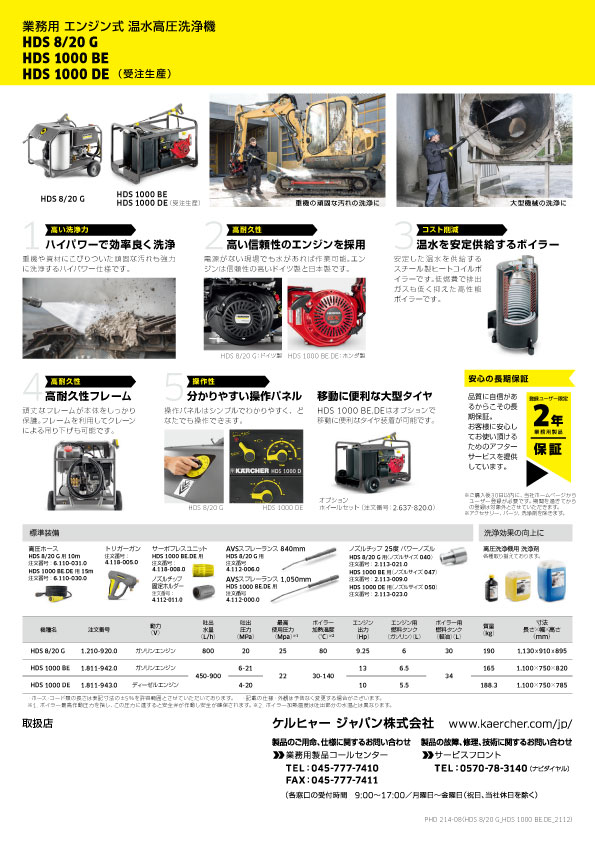 HDS 1000 BEは電源不要のエンジンタイプのケルヒャー業務用温水高圧洗浄機です。 重機や資材にこびりついた頑固な汚れも強力に洗浄するハイパワー仕様です。 電源がない現場でも、水さえあれば作業が可能です。 エンジンは信頼性の高いホンダ製。 熱効率に優れた高性能ヒートコイルボイラーは、長時間の使用でも安定した温水を供給します 低燃費を実現し排出ガスも低く抑えます。 頑丈なフレームが、ボディをしっかりと保護 フレーム部を利用してクレーンによる吊り下げも可能 1.ハイパワーで効率良く洗浄 重機や資材にこびりついた頑固な汚れも強力に洗浄するハイパワー仕様です 2.高い信頼性のエンジン 電源がない現場でも水があれば作業可能。エンジンは信頼性の高いホンダ製です 3.温水を安定供給するボイラー 安定した温水を供給するステンレス製ヒートコイルボイラーです。 低燃費で排出ガスも低く抑えた高性能ボイラーです。 4.高耐久性フレーム 頑丈なフレームが本体をしっかり保護。 フレームを利用してクレーンによる吊り下げも可能です 5.優れた操作性 操作パネルはシンプルでわかりやすくどなたでも操作できます。 HDS 1000 BEはオプションで移動に便利なタイヤ装着が可能です。 |