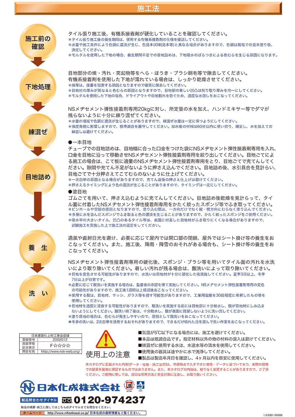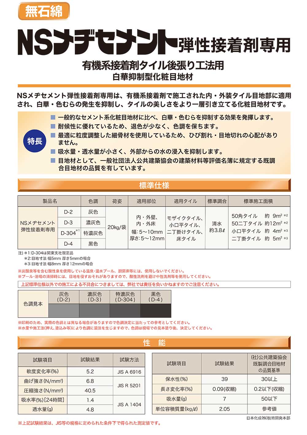 有機系接着剤タイル後張り工法用 白華抑制型化粧目地材 NSメヂセメント弾性接着剤専用は、有機系接着剤で施工された内・外装タイル目地部に適用され、白華・色むらの発生を抑制し、タイルの美しさをより一層引き立てる化粧目地材です。 ■ 一般的なセメント系化粧目地材に比べ、白華・色むらを抑制する効果を発揮します。 ■ 耐候性に優れているため、退色が少なく、色調を保ちます。 ■ 最適に粒度調整した細骨材を使用しているため、ひび割れ・目地切れの心配がありません。 ■ 吸水量・透水量が小さく、外部からの水の浸入を抑制します。 ■ 目地材として、一般社団法人公共建築協会の建築材料等評価名簿に規定する既調合目地材の品質を有しています。 |