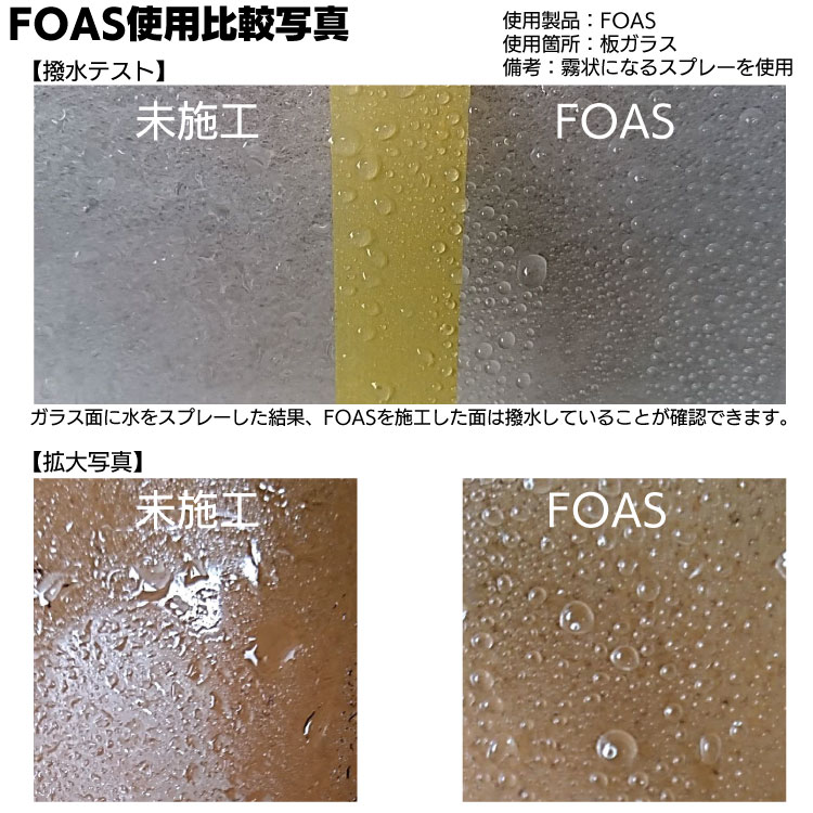 | キーワード | サンエスエンジニアリング FOAS ガラス専用長期間撥水持続性コーティング剤 ガラス撥水剤 ガラスコーティング ガラス専用 ノンワイパー 撥水 撥油 防汚コーティング 自動車 フロントガラス 自動車 バス 電車 船舶 建築物 |
