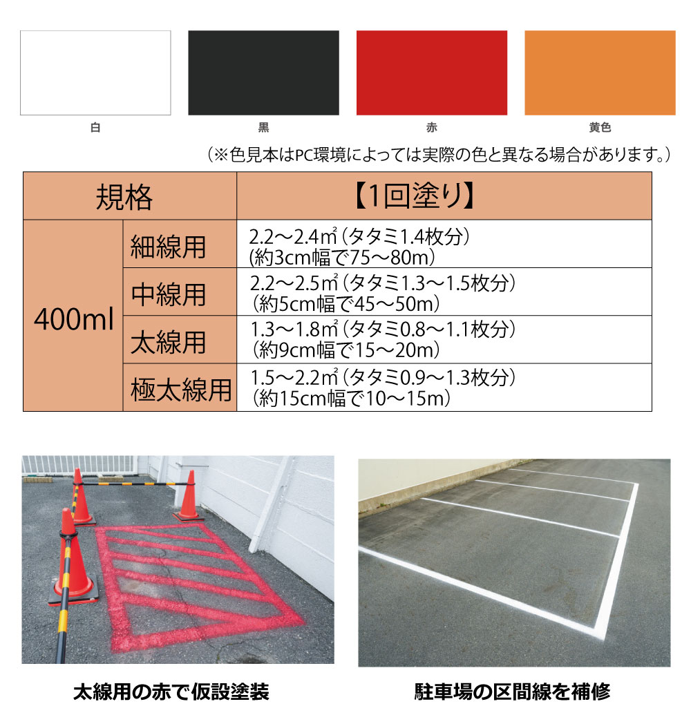 【適した場所】 屋内外区分:屋内外用 ■駐車場、工事現場、倉庫、競技場などのアスファルト面・コンクリート面のライン引きやマーキングに。 |