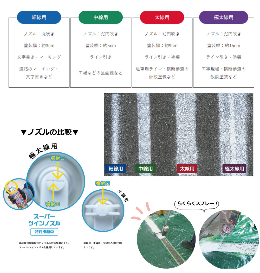 ■速乾性でアスファルトに塗ってもにじみまない ■スプレーライナーを使いアスファルト・コンクリートなどに手軽に線が引ける。 ■手でスプレーする事もでき、マーキング用としても使用可。 ■使用後容易に且つ安全に廃棄できるガス抜きキャップ付き。 |