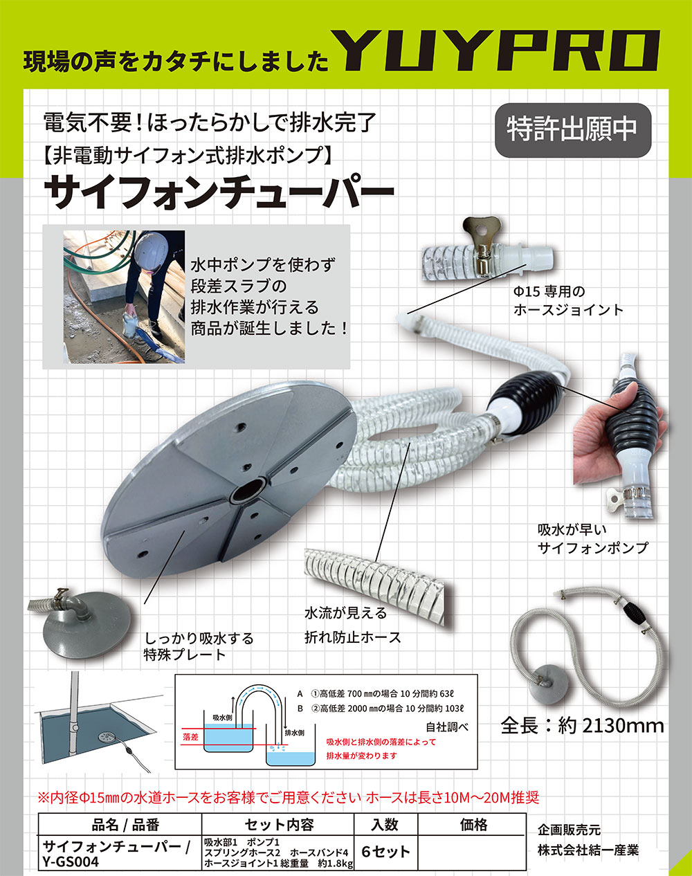 | キーワード | YUYPRO 結一産業 サイフォンチューパー Y-GS004 特許出願中 電気不要 ほったらかしで排水完了 非電動サイフォン式排水ポンプ 水中ポンプを使わず段差スラブの排水作業が行える 電気を使わない 持ち運び簡単 |