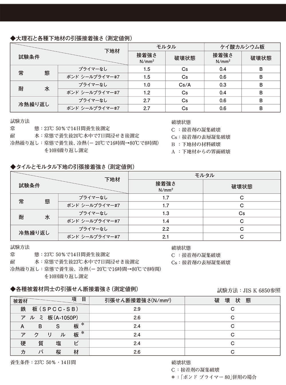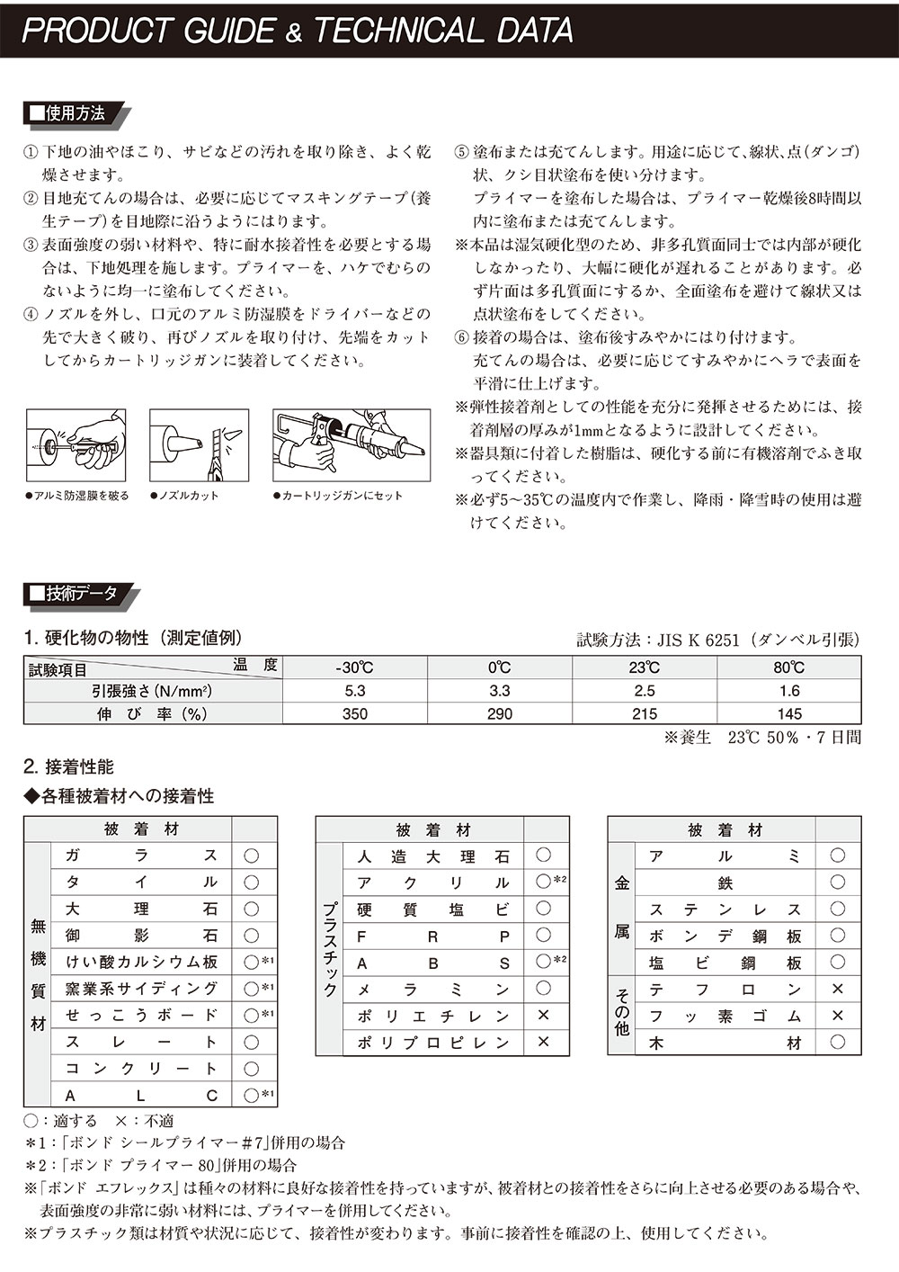 ●TM工法の二次接着 ●内装石材の接着(天然、人造石材) ●内装タイルの接着 ●異種材料の接着 ●表面強度の弱い材料との接着 ●凹凸のある被着材への充てん接着 ●コンクリートのひび割れUカット補修 ●目地のシーリング |