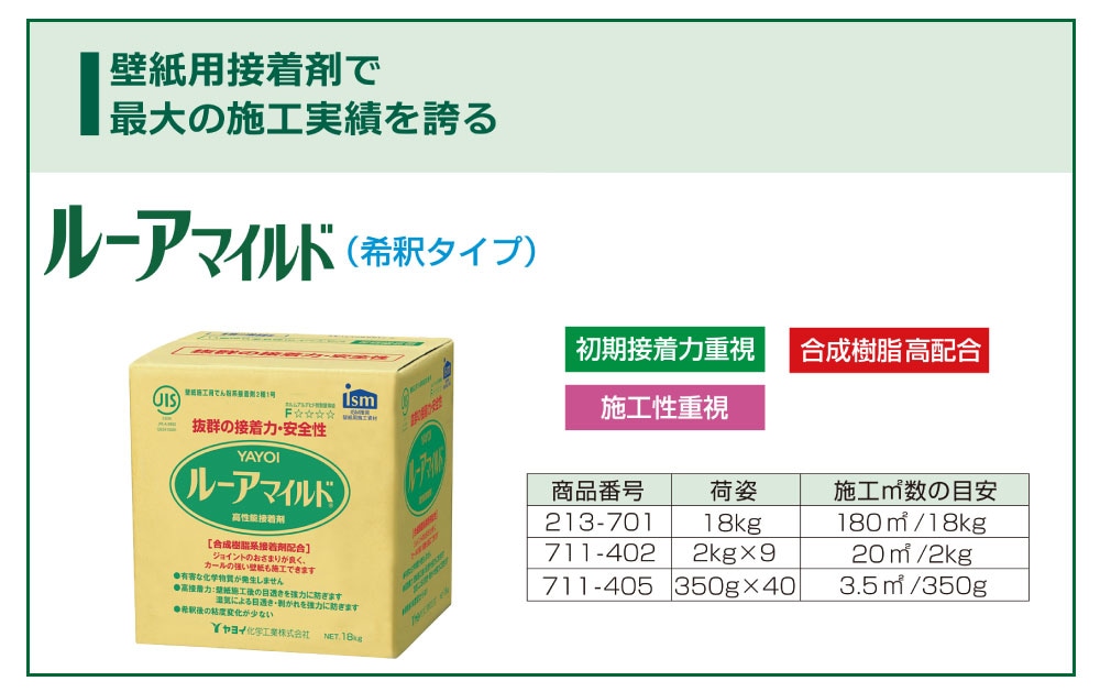 | キーワード | ヤヨイ化学 ヤヨイ ルーアマイルド 壁紙施工用でん粉系接着剤 高性能接着剤 耐湿性能 目透き 剥がれを強力に抑える ISM推奨壁紙用施工資材 合成樹脂系接着剤配合 壁紙 |