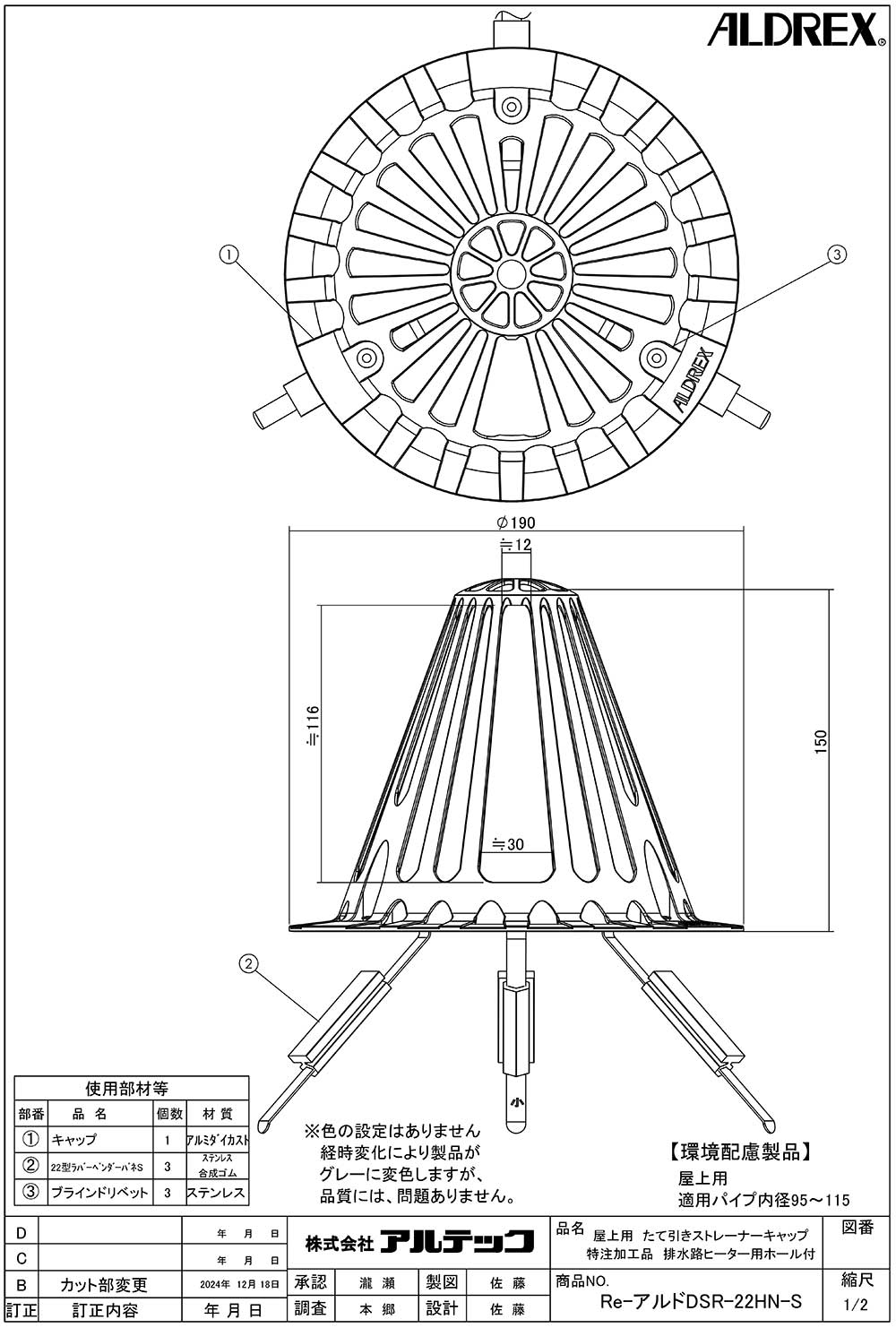 | キーワード | アルテック 屋上用 たて引きストレーナーキャップ 環境配慮製品 特注加工品 排水路ヒーター用ホール付き Re-アルドDSR-22HN-S ベンダー方式 アルミニウム合金 工具不要 95~115用 |
