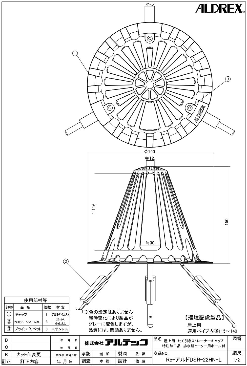 | キーワード | アルテック 屋上用 たて引きストレーナーキャップ 環境配慮製品 特注加工品 排水路ヒーター用ホール付き Re-アルドDSR-22HN-L ベンダー方式 アルミニウム合金 工具不要 115~140用 |
