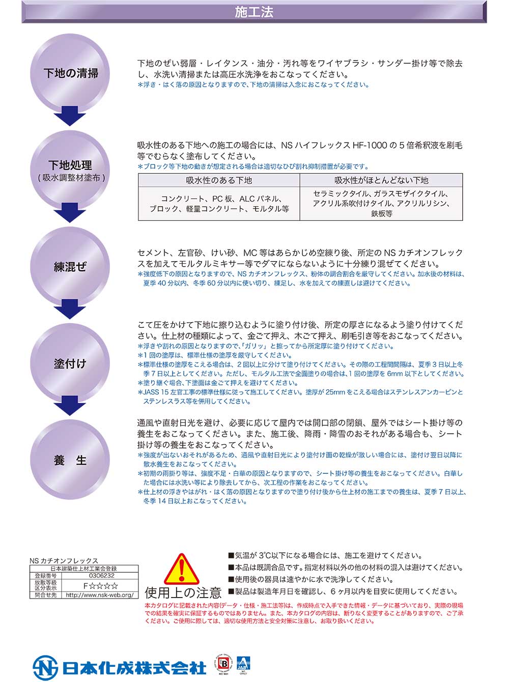 補修改修工事材 セメント混和用カチオン系SBRラテックス ・NS カチオンフレックスは、 特殊変性のセメント混和用カチオン系スチレンブタジエンゴムラテックス(SBR)です。 ・NS カチオンフレックスを混入したポリマーセメントモルタルは、 改修・補修工事用として広範囲に使用できます。 ・各種下地に対する接着性に優れています。 ・原液練りで水を加える必要がないため、品質管理が容易です。 ホルムアルデヒド放散等級 F ☆☆☆☆ |