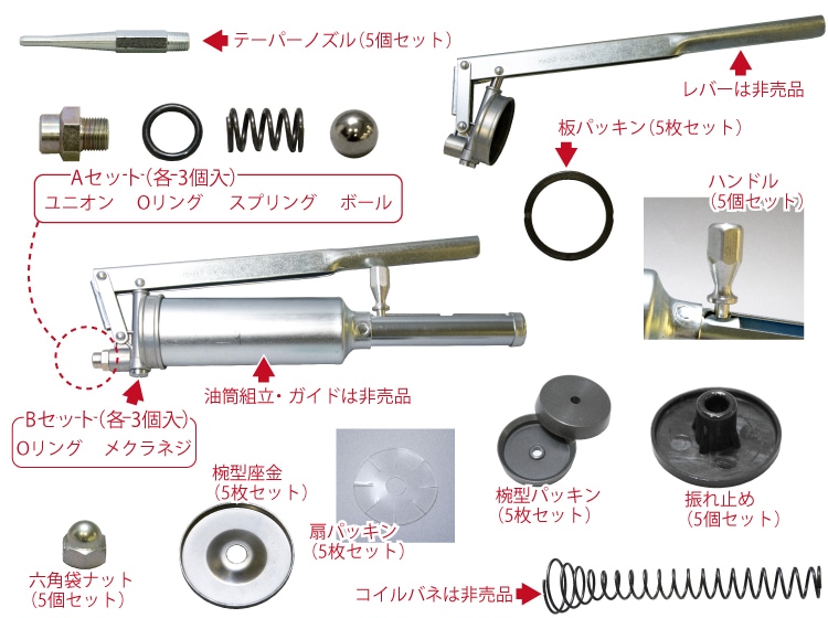 ・板パッキン(5枚) ・椀型パッキン(5枚) ・Oリング大(3個) ・Oリング小(3個) |