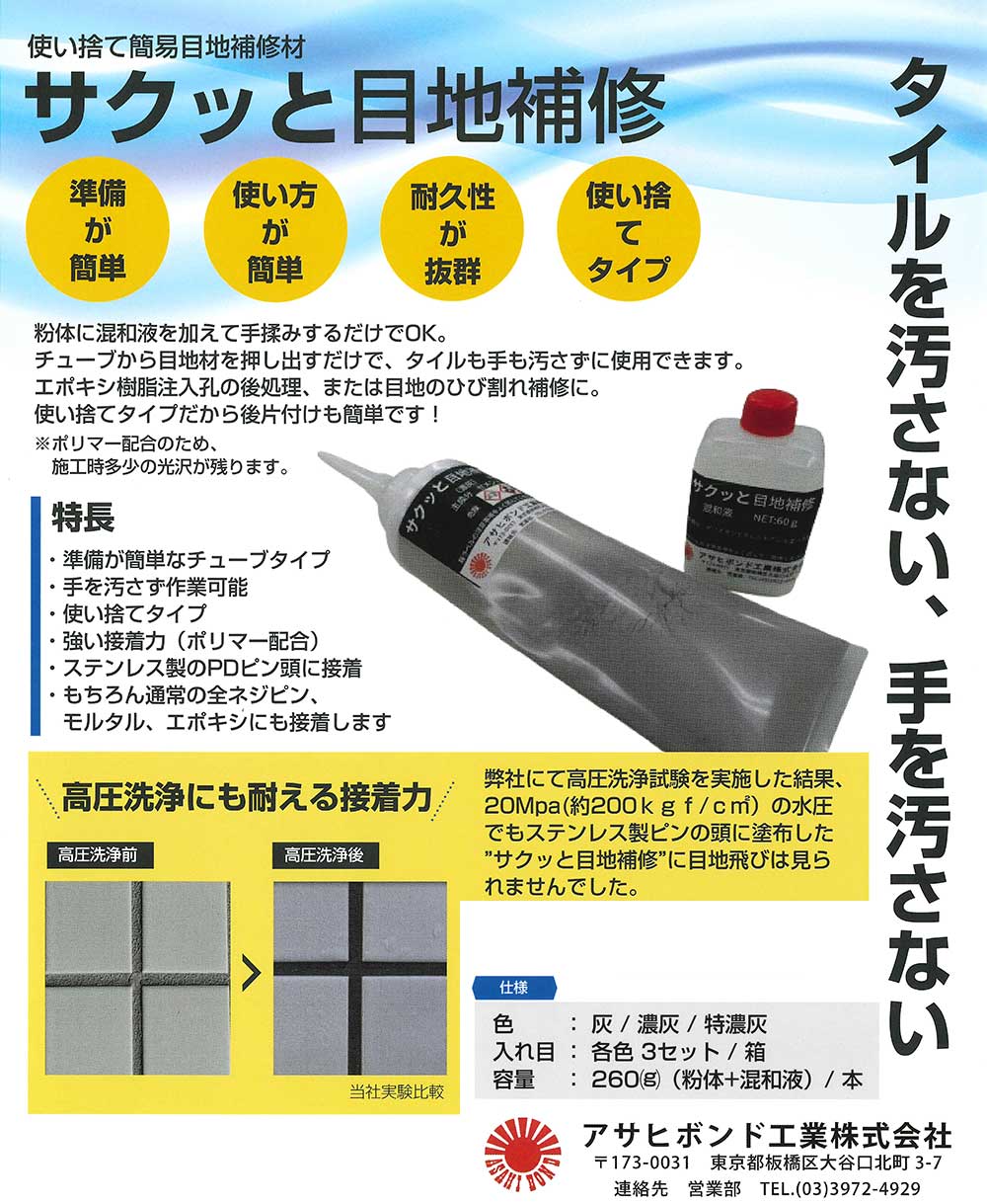 | キーワード | アサヒボンド工業 サクッと目地補修 手揉みするだけ 簡易目地補修材 チューブ 目地材を押し出すだけ タイル 手も汚さず 使い捨てタイプ 後片付けも簡単 ポリマー配合のため、施工時多少の光沢が残ります 準備が簡単 チューブタイプ 手を汚さず作業可能 使い捨てタイプ 高圧洗浄でも目地飛びが起きにくい強い接着力 ステンレス製のPDピン頭に接着 通常の全ネジピン モルタル エポキシ 接着 |