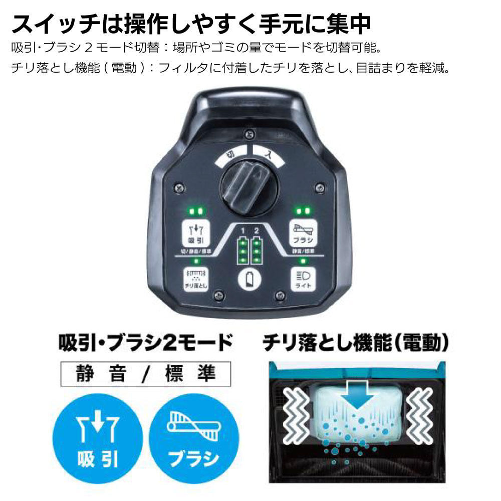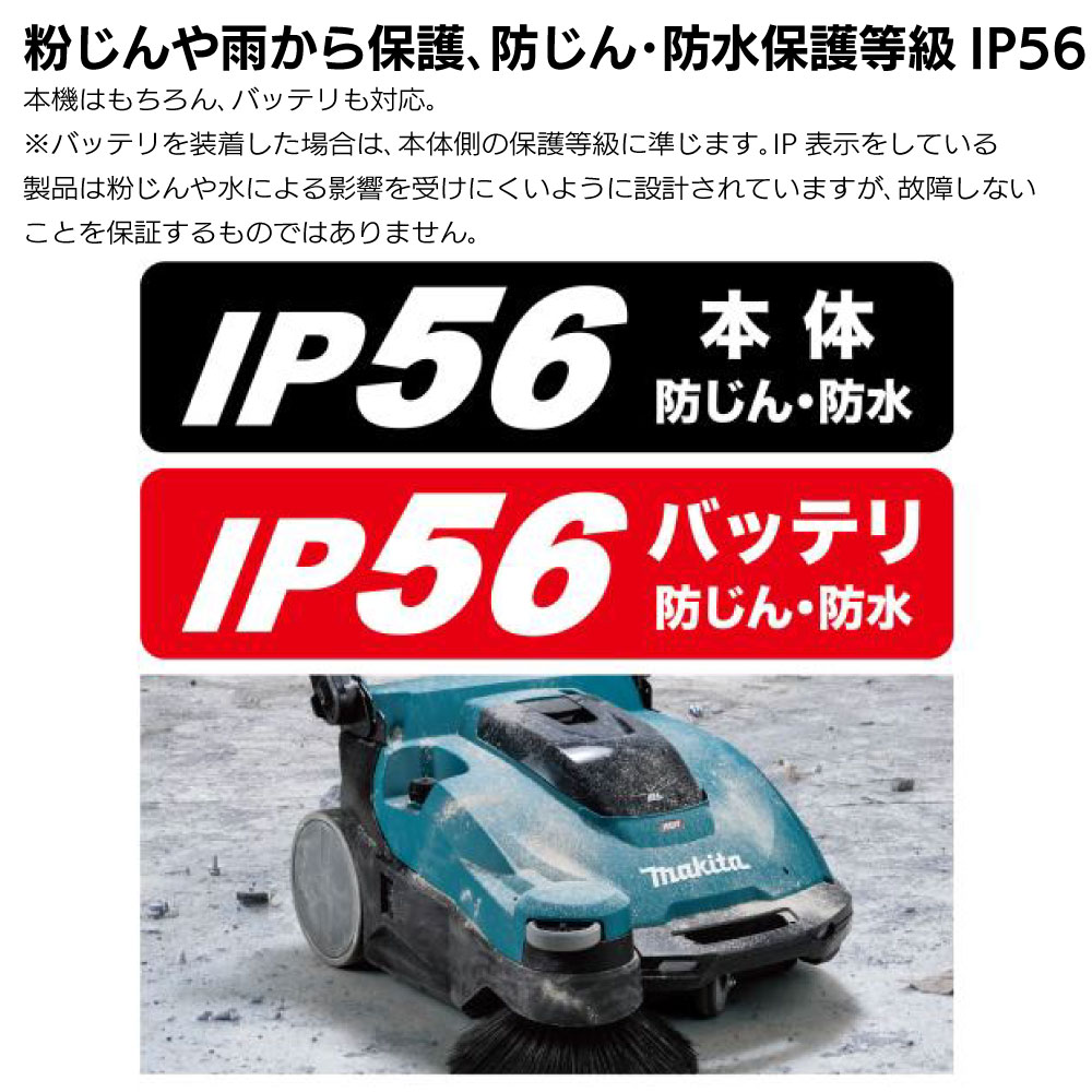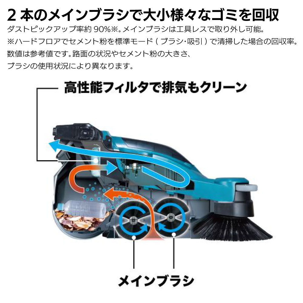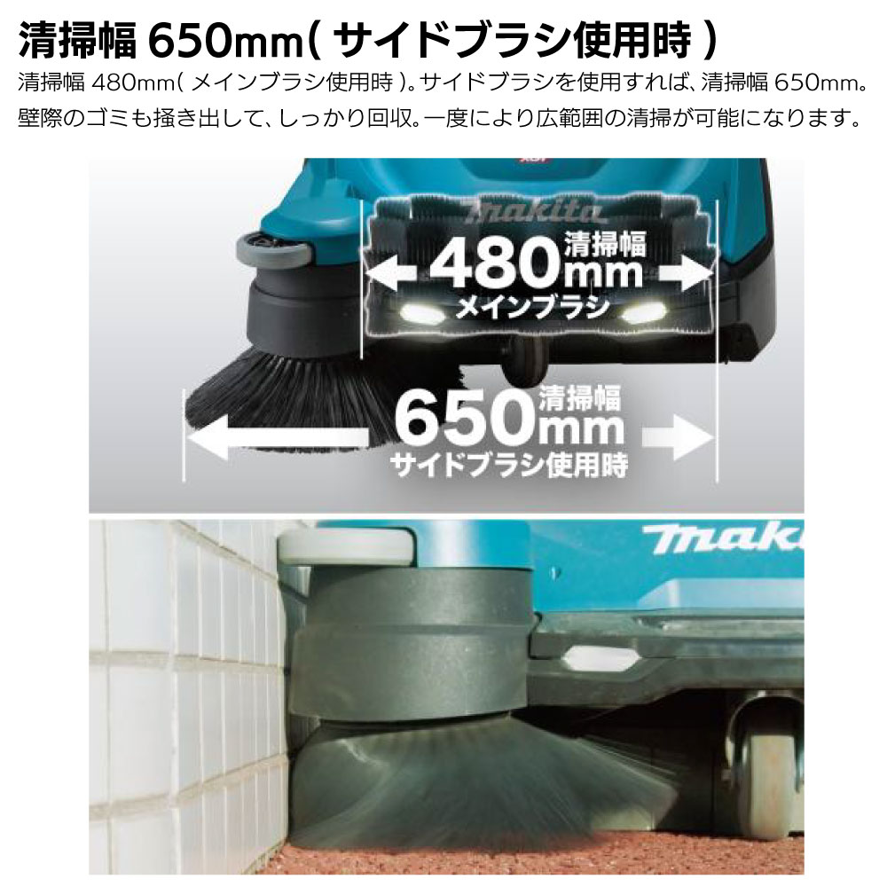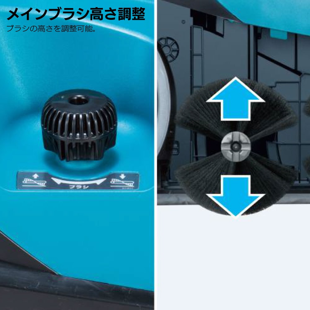 <ハイパワーブラシレスモータ搭載> 集じん用、メインブラシ(サイドブラシ含む)用にそれぞれハイパワーブラシレスモータを搭載。パワフルな清掃を実現しました。 チリ落とし用にも専用のモータを採用しています。 <2本のメインブラシで大小様々なゴミを回収> ダストピックアップ率約90%。(※ハードフロアでセメント粉を標準モード(ブラシ・吸引)で清掃した場合の回収率。)数値は参考値です。 路面の状況やセメント粉の大きさ、ブラシの使用状況により異なります。 メインブラシは工具レスで取り外し可能。 <清掃幅650mm(サイドブラシ使用時)> 清掃幅480mm(メインブラシ使用時)。サイドブラシを使用すれば、清掃幅650mm。 壁際のゴミも掻き出して、しっかり回収。 一度により広範囲の清掃が可能になります。 <スイッチは操作しやすく手元に集中> 吸引・ブラシ2モード切替:場所やゴミの量でモードを切替可能。 チリ落とし機能(電動):フィルタに付着したチリを落とし、目詰まりを軽減。 <粉じんや雨から保護(防じん・防水保護等級IP56)> 本機はもちろん、バッテリも対応。※バッテリを装着した場合は、本体側の保護等級に準じます。 ※ IP表示をしている製品は粉じんや水による影響を受けにくいように設計されていますが、故障しないことを保証するものではありません。 <バッテリは2本(並列)装着可能> バッテリ1本で作動します。1本目のバッテリ残量がなくなると2本目に自動切替。 <1充電あたりの連続作業時間(目安)> 約3時間20分(バッテリ BL4080F×2本装着時/標準モード)※数値は参考値です。バッテリの充電状態や作業条件により異なります。 |