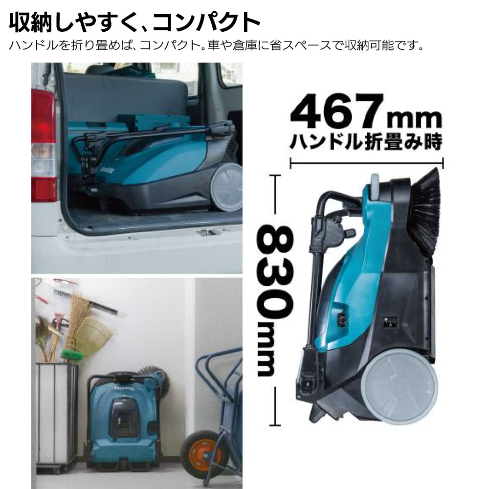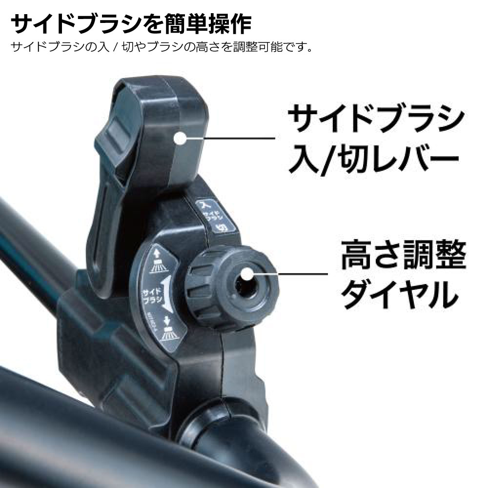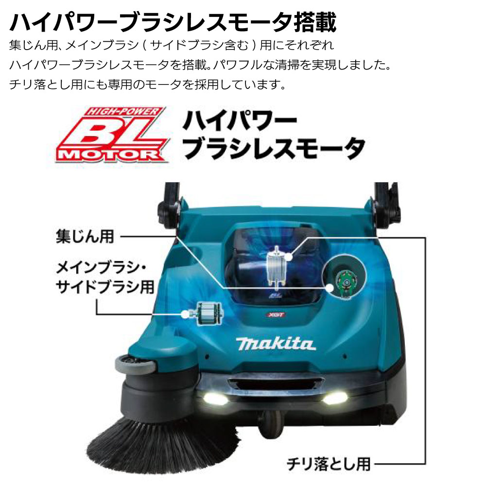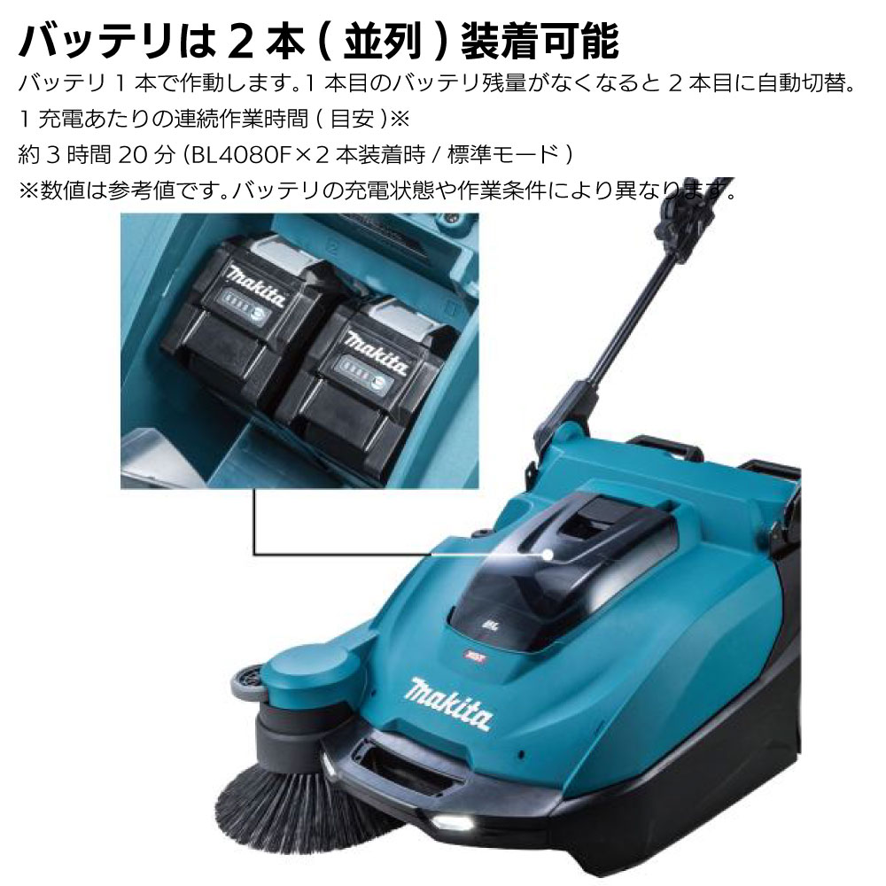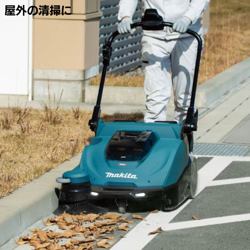 <ハイパワーブラシレスモータ搭載> 集じん用、メインブラシ(サイドブラシ含む)用にそれぞれハイパワーブラシレスモータを搭載。パワフルな清掃を実現しました。 チリ落とし用にも専用のモータを採用しています。 <2本のメインブラシで大小様々なゴミを回収> ダストピックアップ率約90%。(※ハードフロアでセメント粉を標準モード(ブラシ・吸引)で清掃した場合の回収率。)数値は参考値です。 路面の状況やセメント粉の大きさ、ブラシの使用状況により異なります。 メインブラシは工具レスで取り外し可能。 <清掃幅650mm(サイドブラシ使用時)> 清掃幅480mm(メインブラシ使用時)。サイドブラシを使用すれば、清掃幅650mm。 壁際のゴミも掻き出して、しっかり回収。 一度により広範囲の清掃が可能になります。 <スイッチは操作しやすく手元に集中> 吸引・ブラシ2モード切替:場所やゴミの量でモードを切替可能。 チリ落とし機能(電動):フィルタに付着したチリを落とし、目詰まりを軽減。 <粉じんや雨から保護(防じん・防水保護等級IP56)> 本機はもちろん、バッテリも対応。※バッテリを装着した場合は、本体側の保護等級に準じます。 ※ IP表示をしている製品は粉じんや水による影響を受けにくいように設計されていますが、故障しないことを保証するものではありません。 <バッテリは2本(並列)装着可能> バッテリ1本で作動します。1本目のバッテリ残量がなくなると2本目に自動切替。 <1充電あたりの連続作業時間(目安)> 約3時間20分(バッテリ BL4080F×2本装着時/標準モード)※数値は参考値です。バッテリの充電状態や作業条件により異なります。 |