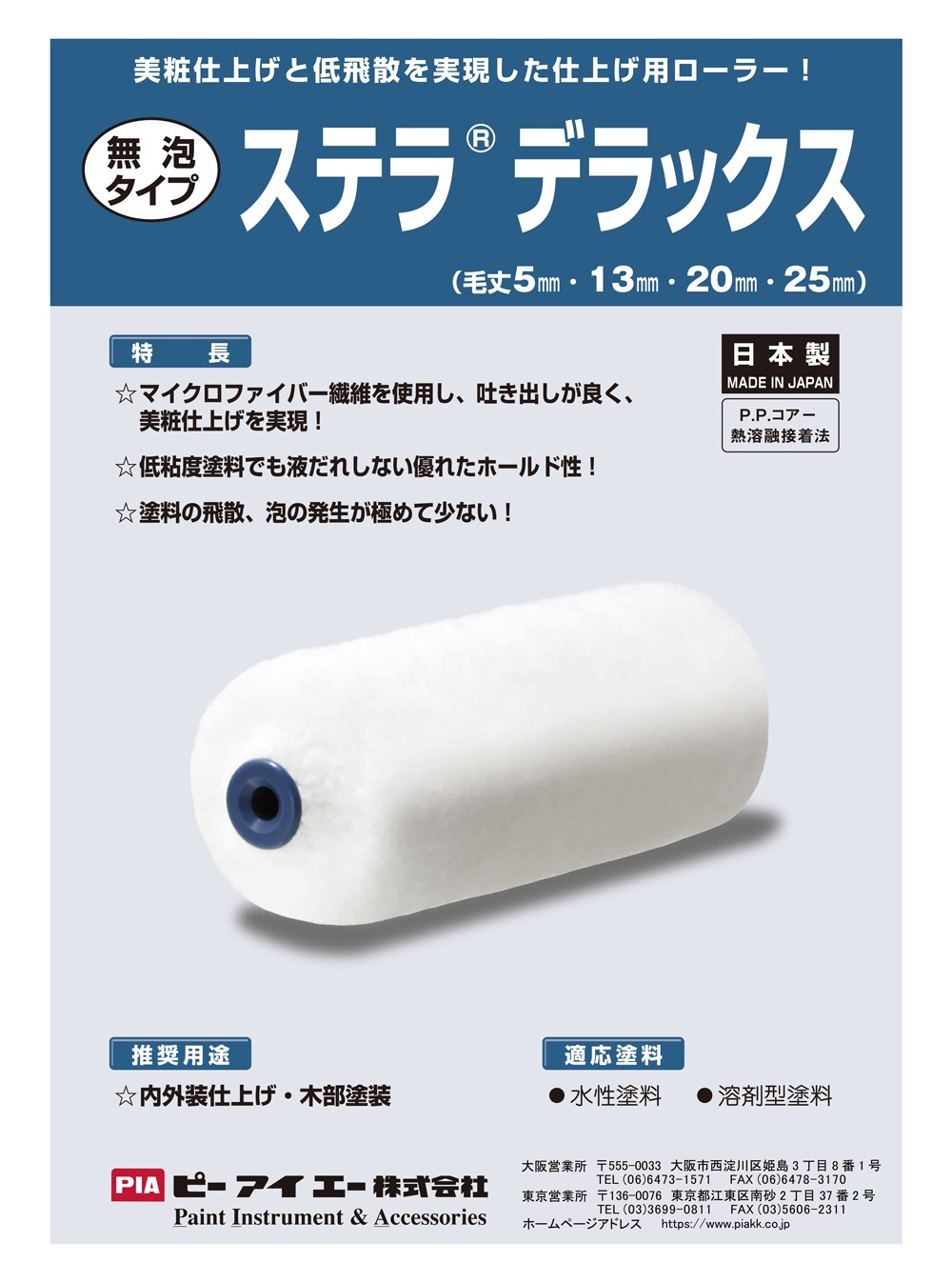 | キーワード | PIA ピーアイエー ローラー P.P.コアー熱溶接着法 外装用 塗料含み 吐き出し抜群 腰が強い 外壁塗装最適 |