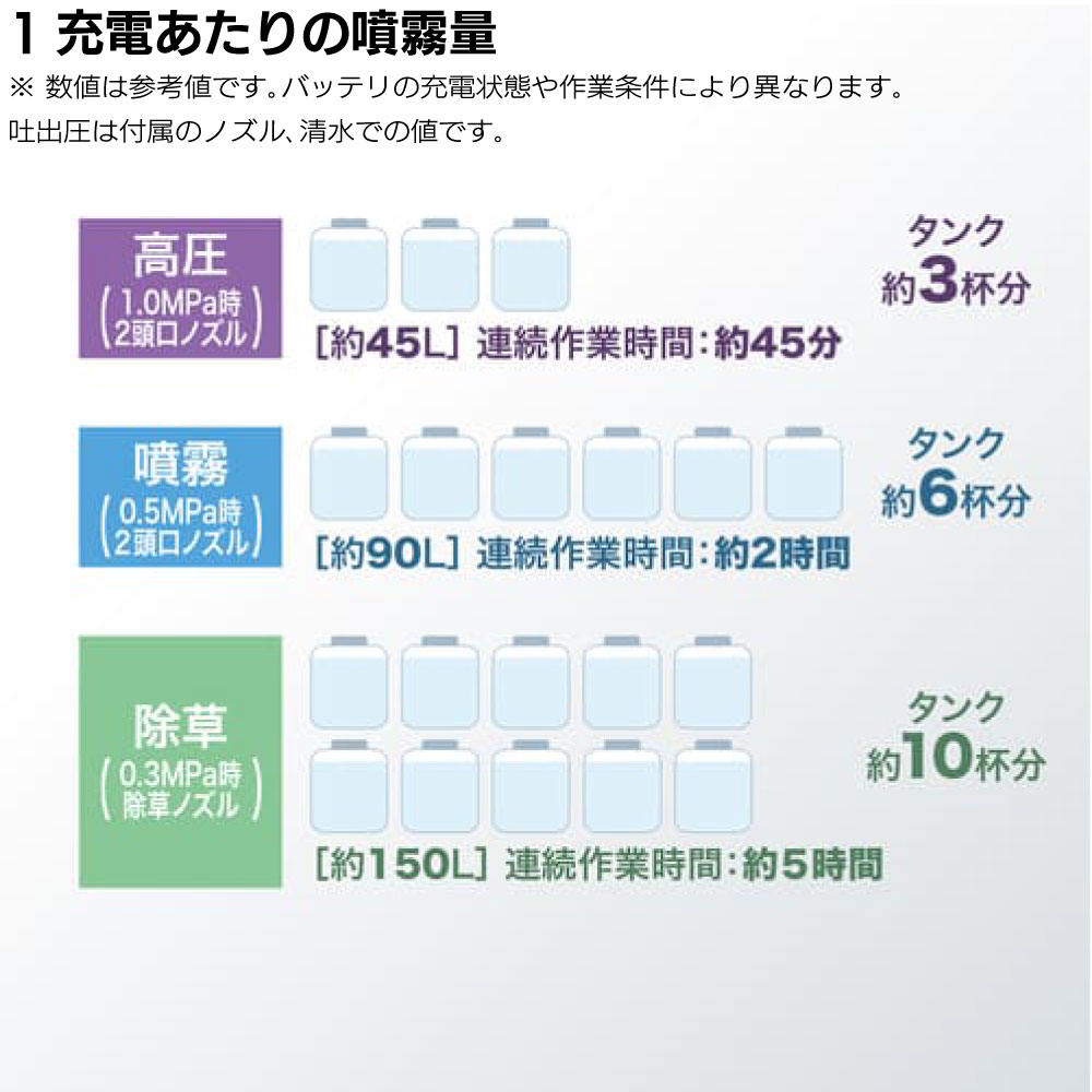 ・タンク容量(L):15 ・最高圧力(MPa):1.0 ・吐出量[L/分]: ※2頭口ノズル:約1.3 ※除草剤ノズル:約0.8 ・電源(V):直流18 ・1充電連続運転時間(目安):3.0Ah:約45分~5時間 ※1充電連続運転時間[作業量]の補足:数値は参考値です。バッテリの充電状態や作業条件により異なります。 ・本機寸法(mm):長さ 250 / 幅 370 / 高さ 550 ・質量(kg):5.3 ※質量の補足:バッテリ含む、噴口、噴霧管除く。 ・標準付属品:2頭口ノズル / 除草ノズル / 背負いバンド |