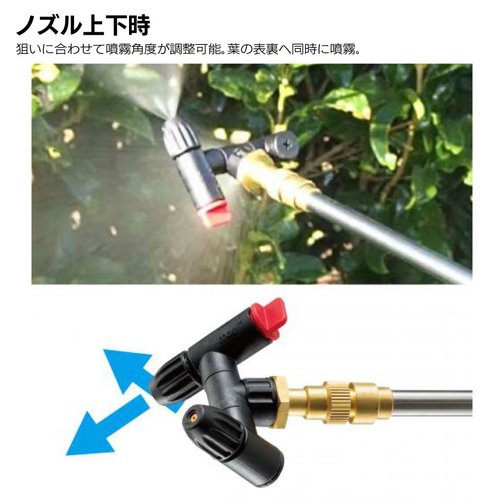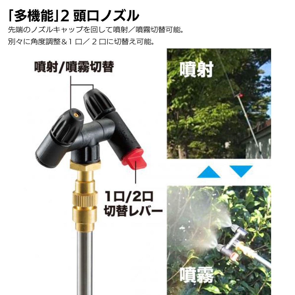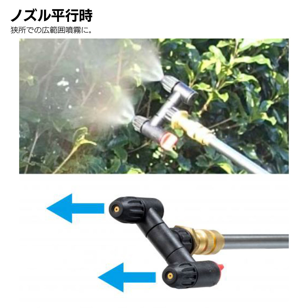 ■パワフルな最高圧力0.3MPa ■タンク容量5Lの軽快な肩掛け式 ■軽量・コンパクト・パワフル ■防除、除草、消毒作業(農業工業用)などの使いやすさ向上 ■様々な噴霧作業を軽快にこなす ■ノズル回転機能付きの「多機能」2頭口ノズル ■ノズル向きは平行・上下など自由自在 ■ノズルは噴射/噴霧切替、1口/2口切替が可能 ■手元でオン/オフできるパドルスイッチ式(ロック付き) ■体にフィットする曲面形状、バッテリはワンタッチ脱着可能 ■防じん・防水保護等級 IP54(本体) ■便利な計量カップ付 |