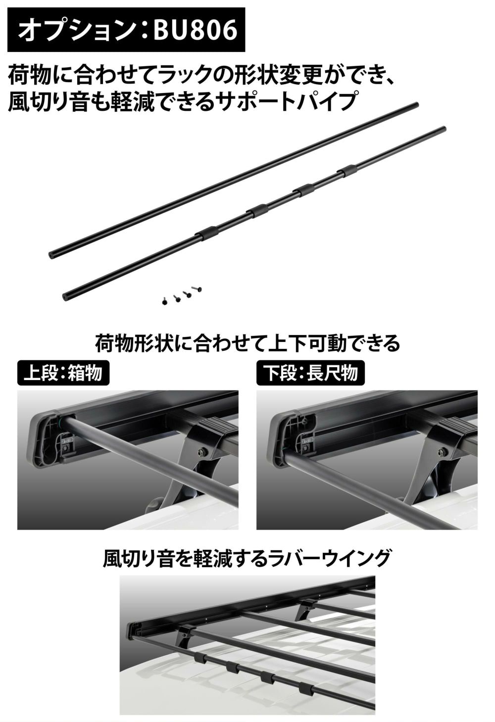 | キーワード | カーメイト ローダウンラック エブリイ ハイゼット BU702用サポートパイプ BU806 INNO 樹脂被膜仕様 ブラック 上下可動 風切り音を軽減 ラバーウイング |