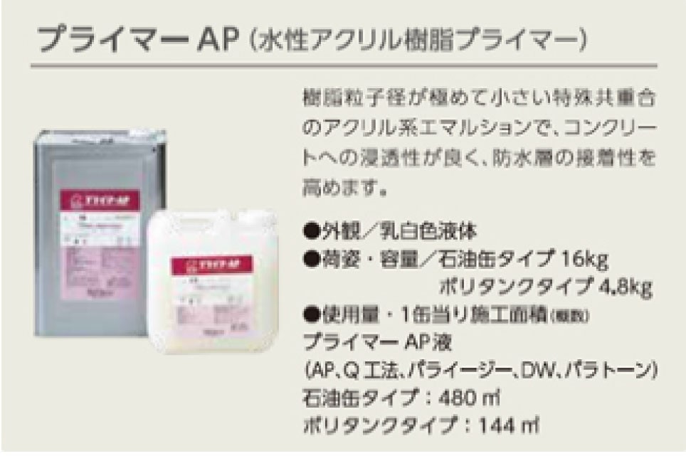 1缶当たり施工面積 プライマーAP液 (AP、Q工法、パライージー、DW、パラトーン) 石油缶タイプ:480m2 ポリタンクタイプ144m2 |