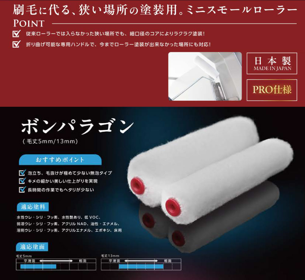 刷毛に代る狭い場所でもラクラク塗装の細口径小型ローラー ・従来ローラーでは入らなかった狭い場所でも、細口径のコアーによりラクラク塗装! ・折り曲げ可能な専用ハンドルで、今までローラー塗装ができなかった場所にも対応! ・泡立ち、毛抜けが極めて少ない無泡タイプ ・キメの細かい美しい仕上がりを実現 ・長時間の作業でもヘタリが少ない |