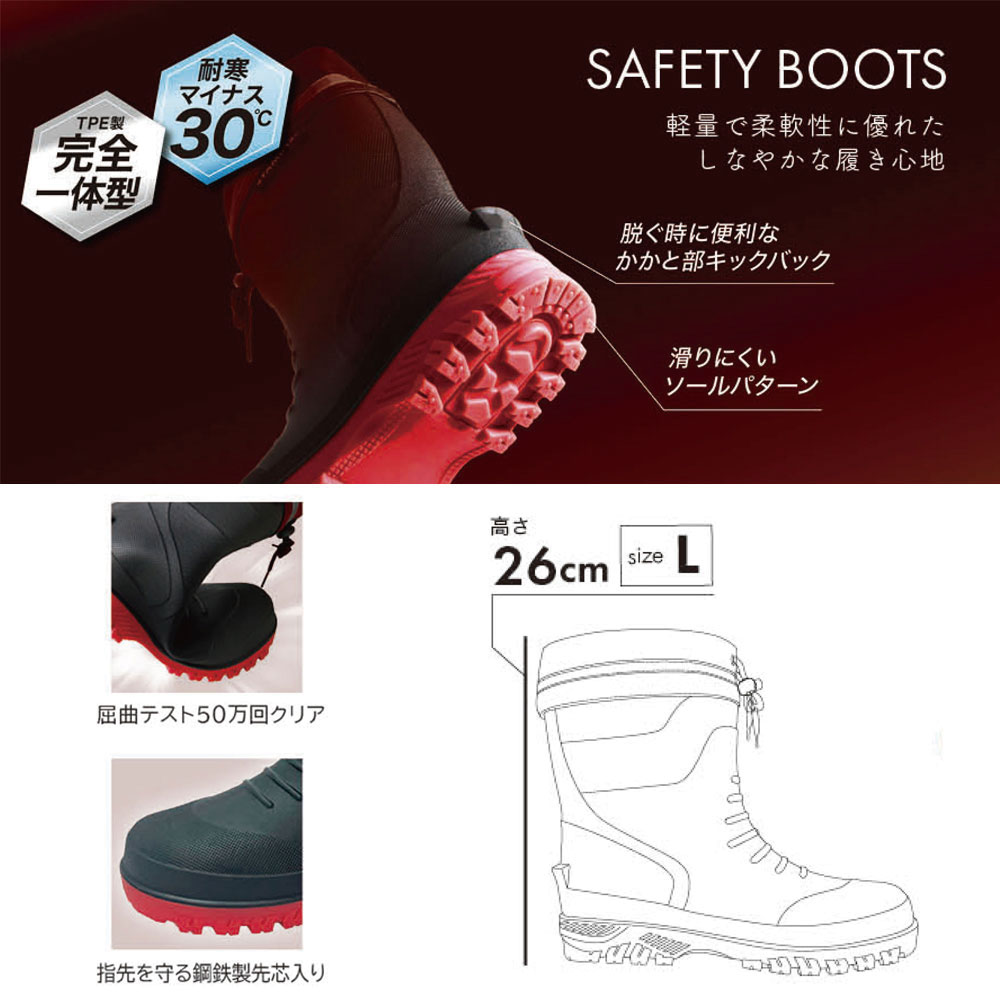 ※屈曲テスト50万回クリア ※耐寒マイナス30℃ ※TPE製完全一体型 ※脱ぐ時に便利なかかと部キックバック滑りにくいソールパターン |