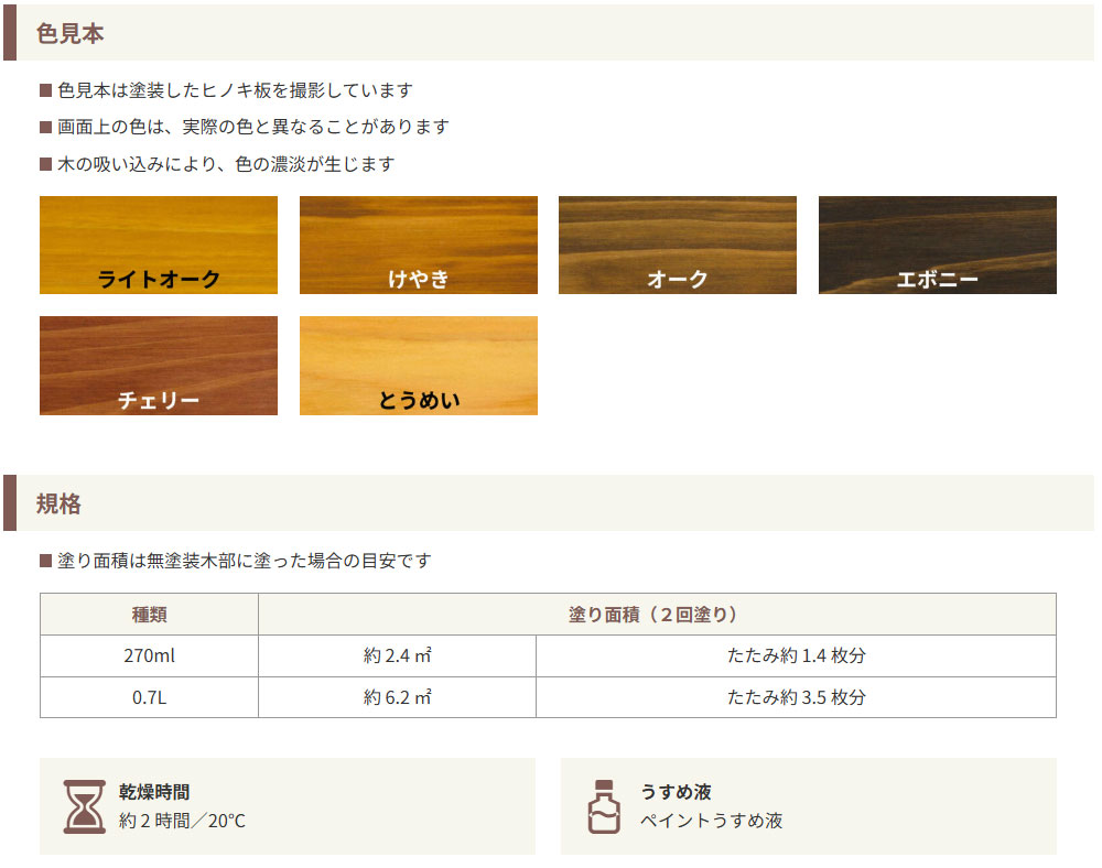 ※無塗装木部に塗った場合の目安です 270ml:約 2.4平米(たたみ約 1.4 枚分) 0.7L:約 6.2平米(たたみ約 3.5 枚分) |