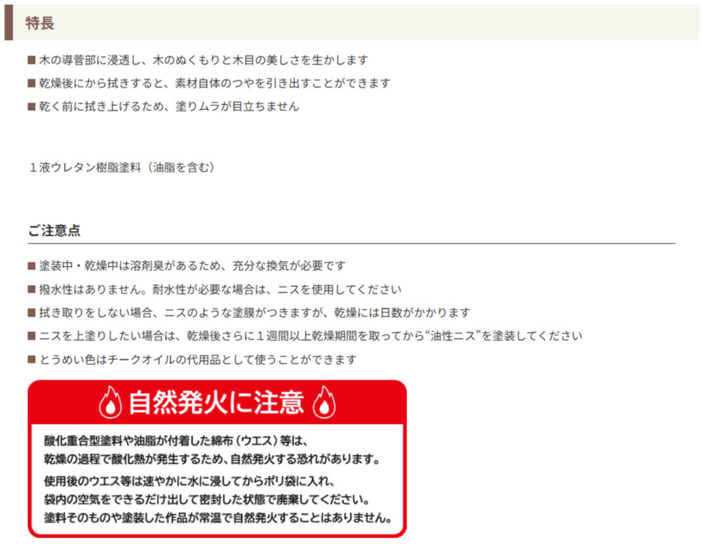 塗装中・乾燥中は溶剤臭があるため、充分な換気が必要です 撥水性はありません。耐水性が必要な場合は、ニスを使用してください 拭き取りをしない場合、ニスのような塗膜がつきますが、乾燥には日数がかかります ニスを上塗りしたい場合は、乾燥後さらに1週間以上乾燥期間を取ってから“油性ニス”を塗装してください とうめい色はチークオイルの代用品として使うことができます |