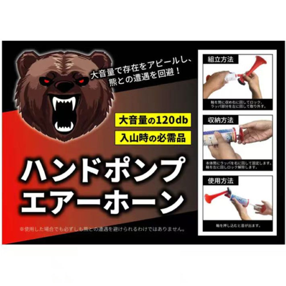入山時の必需品! 大音量で存在をアピールし、熊との遭遇を回避。 ■大音量の最大120db! ■押し引きするだけで何度も音を鳴らせます! ■ラッパ部分は取り外しができるので持ち運びに便利! ■スポーツ観戦の応援にも! 熊は基本的には人間との遭遇を避ける生き物です。 入山時に適度に鳴らしながら行動する事で、熊との遭遇を避けることが出来ます。 ※使用した場合でも必ずしも熊との遭遇を避けられるわけではありません。 |