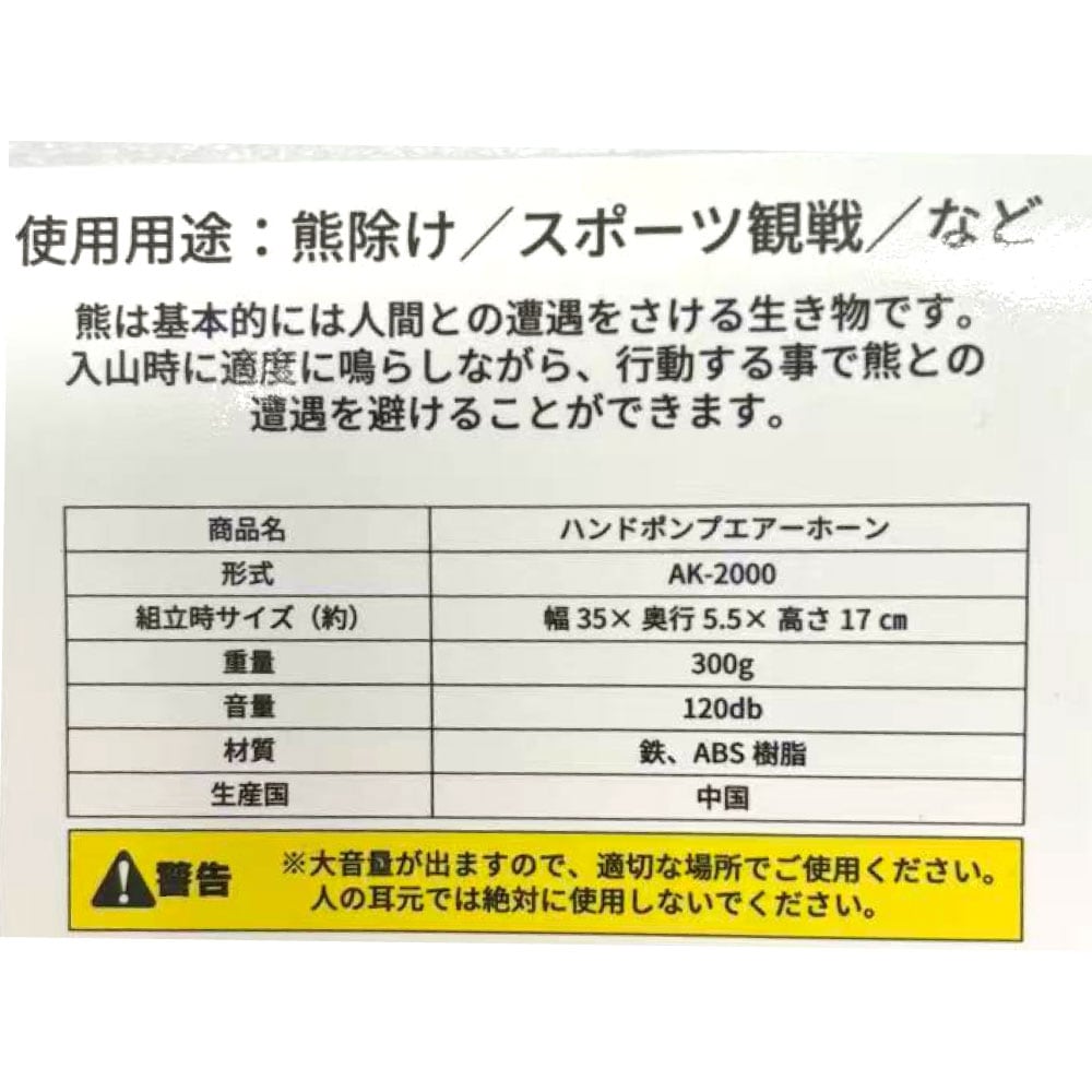 | キーワード | ALUMIS アルミス 熊よけ ハンドポンプエアーホーン AK-2000 大音量 手動 登山 キャンプ 熊対策 護身用 スポーツ 応援 |