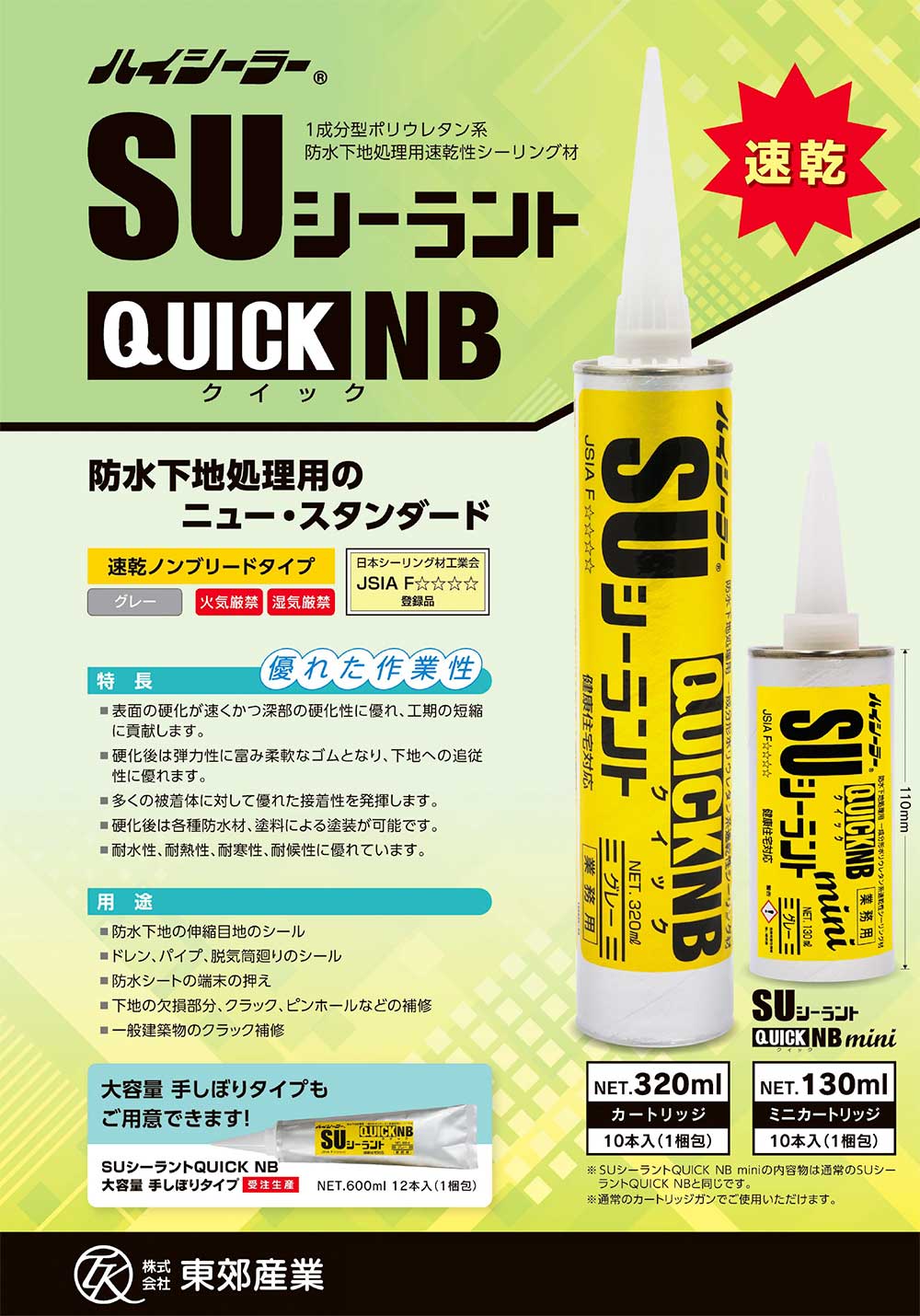 防水下地処理用のニュー・スタンダード 速乾ノンブリードタイプ JSIA F☆☆☆ ●表面硬化が速くかつ深部の硬化性に優れ、工期の短縮に貢献します。 ●硬化後は弾力性に富み柔軟なゴムとなり、下地への追従性に優れます。 ●多くの被着体に対して優れた接着性を発揮します。 ●硬化後は各種防水材、塗料による塗装が可能です。 ●耐水性、耐熱性、耐寒性、対候性に優れています。 |