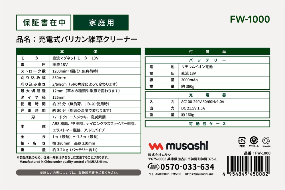 | 商品名 | 充電式バリカン雑草クリーナー FW-1000 |