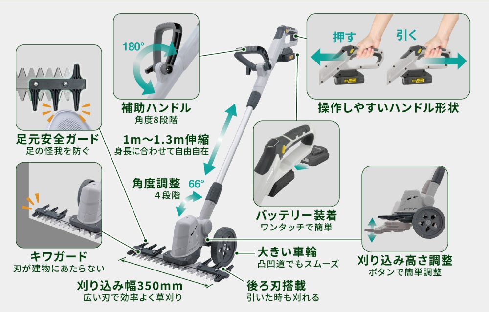 まるで掃除機!雑草クリーナー 走らせるだけで楽に除草! 大きな車輪で軽い! ■走らせるだけで楽に除草 ■掃除機のようにすいすい刈れる! ■安心・安全設計 ■前後を刈れ、石ハネしにくい! ■家のキワ刈りや砂利の多い駐車場で |