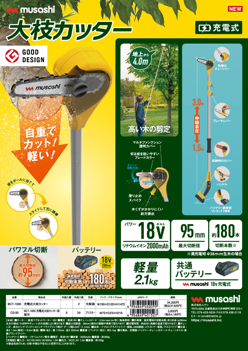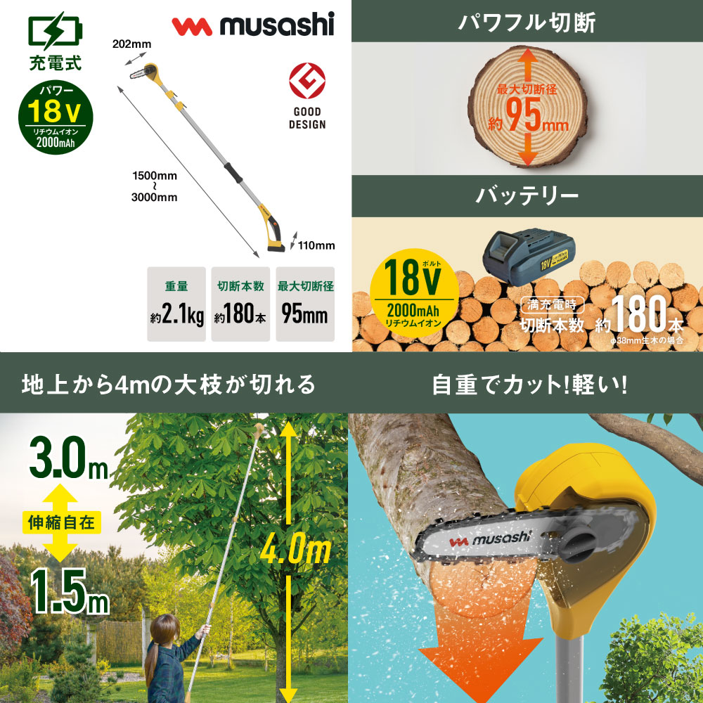 | キーワード | ムサシ 株式会社ムサシ 園芸 園芸用品 農園 農園用品 安心 草 庭 機械 簡単 楽 快適 時短 中木 綺麗 電動工具 軽量 スピーディ 手入れ 掃除 駐車場 畑 コードレス 庭木 剪定 ガーデニング グッドデザイン賞 家庭菜園 家周り お庭 手軽 刃 カッター ル構造 チェーンソー 高枝 負担軽減 替刃 |