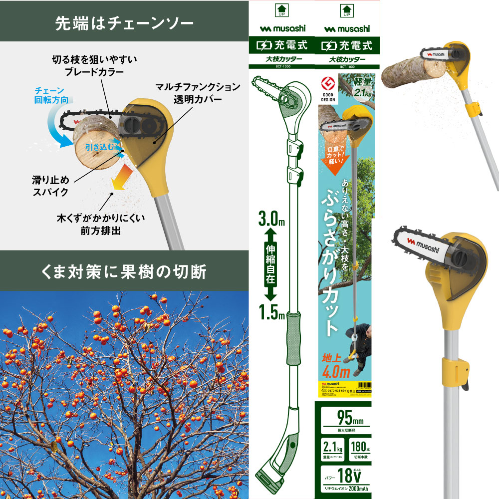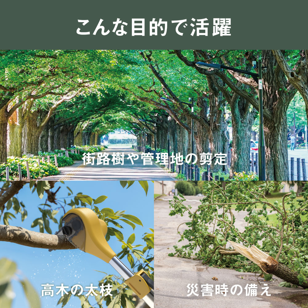 充電式大枝カッター 地上から伸縮自在で最大4mの大枝が切れる! ■自重でカット!軽い! ■パワフル切断!最大切断径約95mm ■満充電時切断本数約180本 ■先端はチェーンソー!木くずがかかりにくい前方排出 |